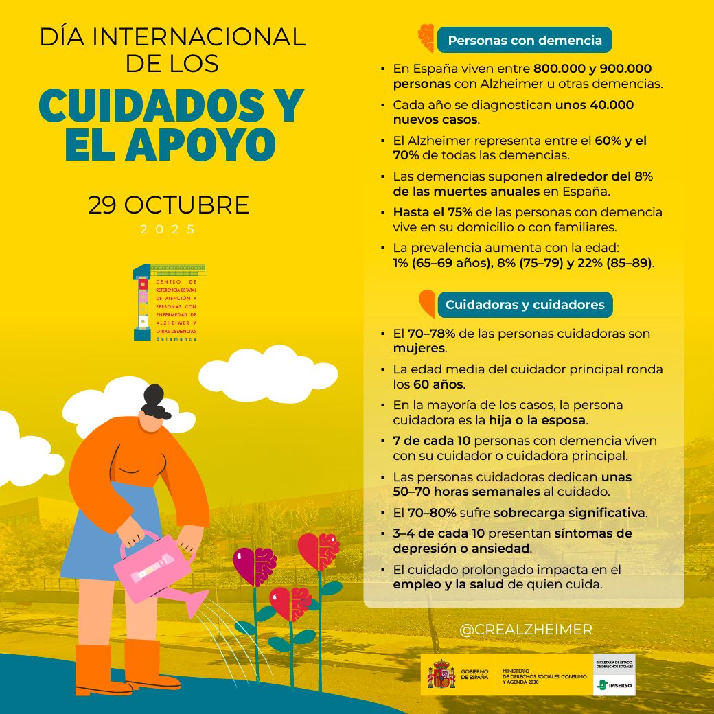 Con motivo del Día Internacional de los Cuidados y el Apoyo, el CREA publica una infografía con datos sobre las personas afectadas por demencia en España y el perfil de quienes las cuidan.