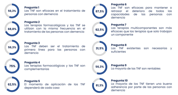 - La mayoría de los participantes considera que las TNF son eficaces en el tratamiento de los síntomas de la demencia y que tienen una buena eficacia en el mantenimiento o retraso del deterioro en diferentes ámbitos.